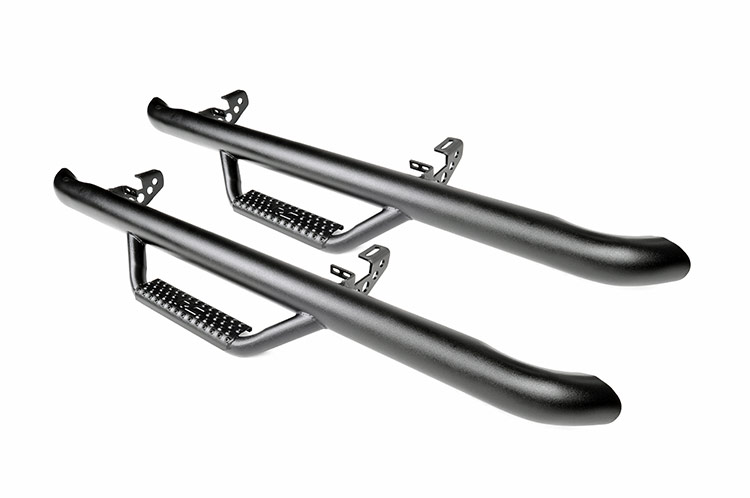 Color: Textured Black Length: 46 in. Drop step design Main bar extends from wheel well to wheel well Bar is positioned high and tight for better fit and cleaner look Added protection from road debris Built from .084 Wall corrosion resistant tubing Solid one-piece construction Helps hide exposed frame under vehicle Works with or without a body lift Limited Lifetime Warranty 2-door models ONLY