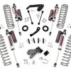 Easy bolt-on installation Increased ground clearance Levels the front with the rear of the vehicle Front adjustable track bar is made of forged solid steel for unsurpassed strength and durability Coil correction plates correct the rear coil spring angle by 10 degrees, allowing them to function more effeciently. // X-Flex Control Arm Details Clevite brand OEM style rubber bushings. Flex joints feature a massive 2.5″ diameter body and 1.25″ thread. Fully greasable. // Vertex Reservoir Shock Details 8-Stage Adjustable Damping Monotube Design Nitrogen-Charged Remote Reservoir with Steel Braided Reservoir Line Massive 2.5in Piston 22mm Chrome-Hardened Piston Rod Specifically Tuned for Each Application 3-Stage Seal System CNC-Machined Billet Aluminum Accents Zinc Plate Finish with Double Clear Coat Incredible >400 Hour Salt Spray Rating 3-year Manufacturer’s Warranty Does NOT fit 2-door models. 2012-2018 models require exhaust modifications to clear the front driveshaft (#1030) On Automatic equipped vehicles; due to use of an oversize driveshaft from the factory and inadequate factory clearance it may be possible for the front driveshaft to come in contact with the automatic transmission pan tearing the factory boot and rubbing on the shaft. Generally this occurs during heavy articulation when front sway bar links are disconnected and longer shocks are installed. If this is found to occur, the proper procedure would be to replace the oversize factory shaft with an aftermarket smaller diameter shaft to increase clearance between the transmission and front driveshaft. Rough Country does offer this driveshaft if needed.